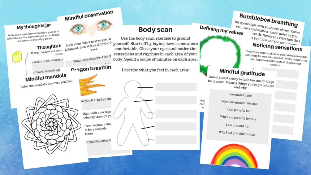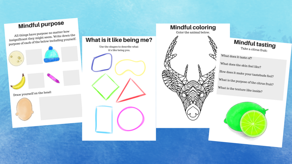 Download your 40 illustrated mindfulness worksheets here. These worksheets are a fun and easy way to practise lots of different mindfulness activities including colouring, breathing techniques and writing.
