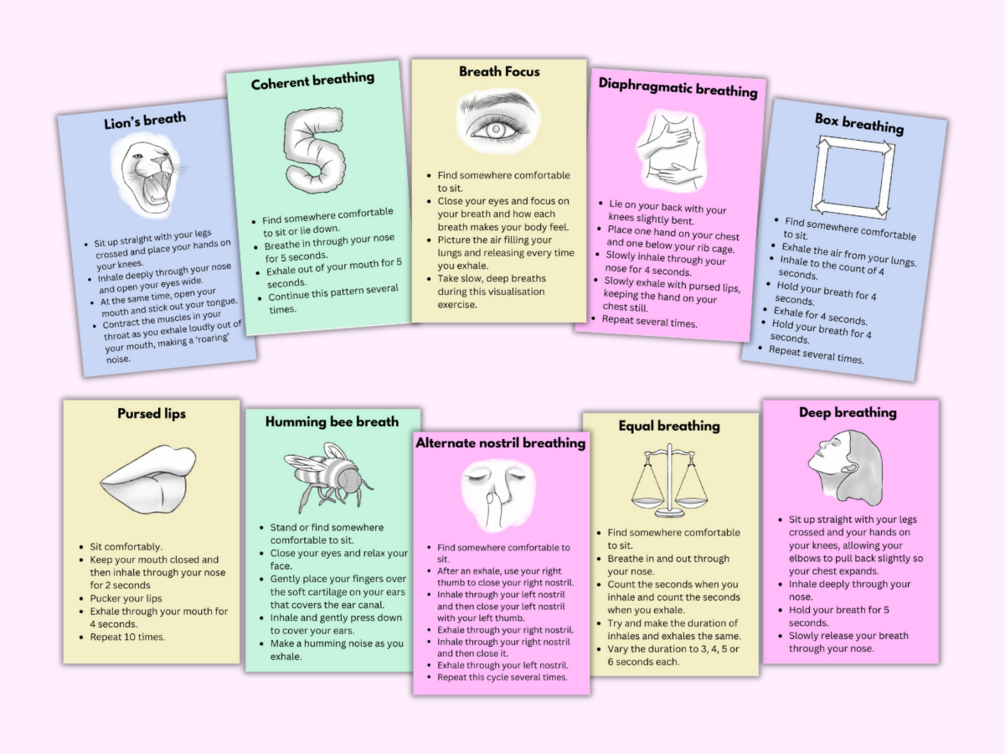 These exercise cards include 10 different breathing exercises for you to practice. Bright and colourful, you'll want to use them every day!